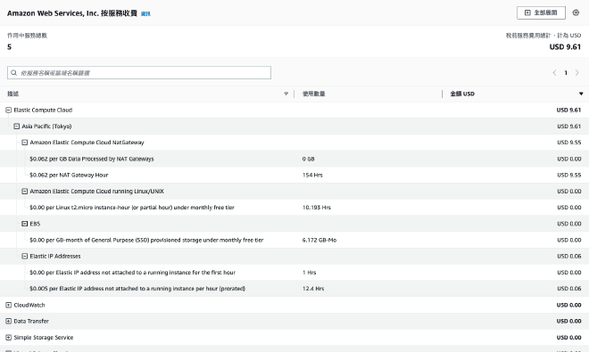 VPC 跟安全群組是必要設定,沒什麼問題,關鍵是那個 NAT Gateway,簡報裡告訴你 Gateway 是個很好用的東西, 可以快速建立跨不同 AZ 的資料傳輸通道,實驗也設計成將服務同時丟到不同 AZ, 畢竟要盡可能提高可用性,這個是以企業提供服務的角度來說,但我一開始的目標是個人服務, 對可用性要求沒那麼大,很顯然這種方式遠超需求,要命的還是 Gateway 的計費方式,啟用時間與傳輸流量分開算, 依照目前 官網 (參照 NAT 閘道) 所述,東京地區的計價標準為 0.062 USD/hr,0.062 USD/GB,簡單來說,就算只是放著,每小時就會累計 0.062 美金,一個月下來,即使傳輸量不到 1GB, 啟用時間部分就高達 44.64 美元。